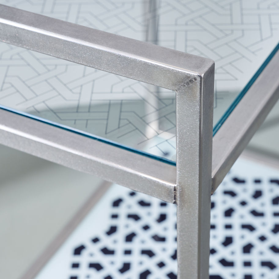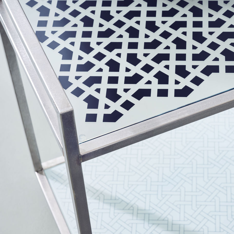 Die Abstelllächen sind aus Glas, wahlweise blank oder mit Mustervarianten bedruckt.