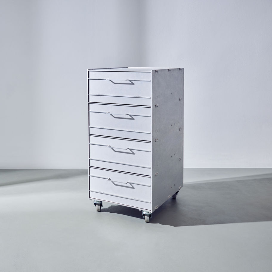 Diese Variante der Schränkchen mit vier Schubladen auf Rädern ist eine Weiterentwicklung von Steckregalen aus Alu: Auch das Schränkchen wird nur zusammengesteckt.
